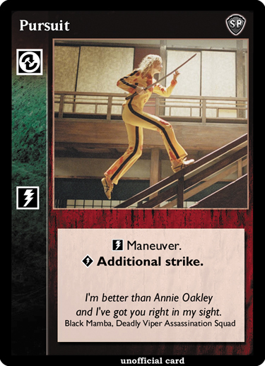 Bill - Budd | Elle - Kenji | O-Ren - Vernita | Johnny - Quentin | Bastard Sword - Day Operation | Desert Eagle - Freak Drive | A Hattori Hanzo Sword - Pursuit | Rolling with the Punches - Temptation